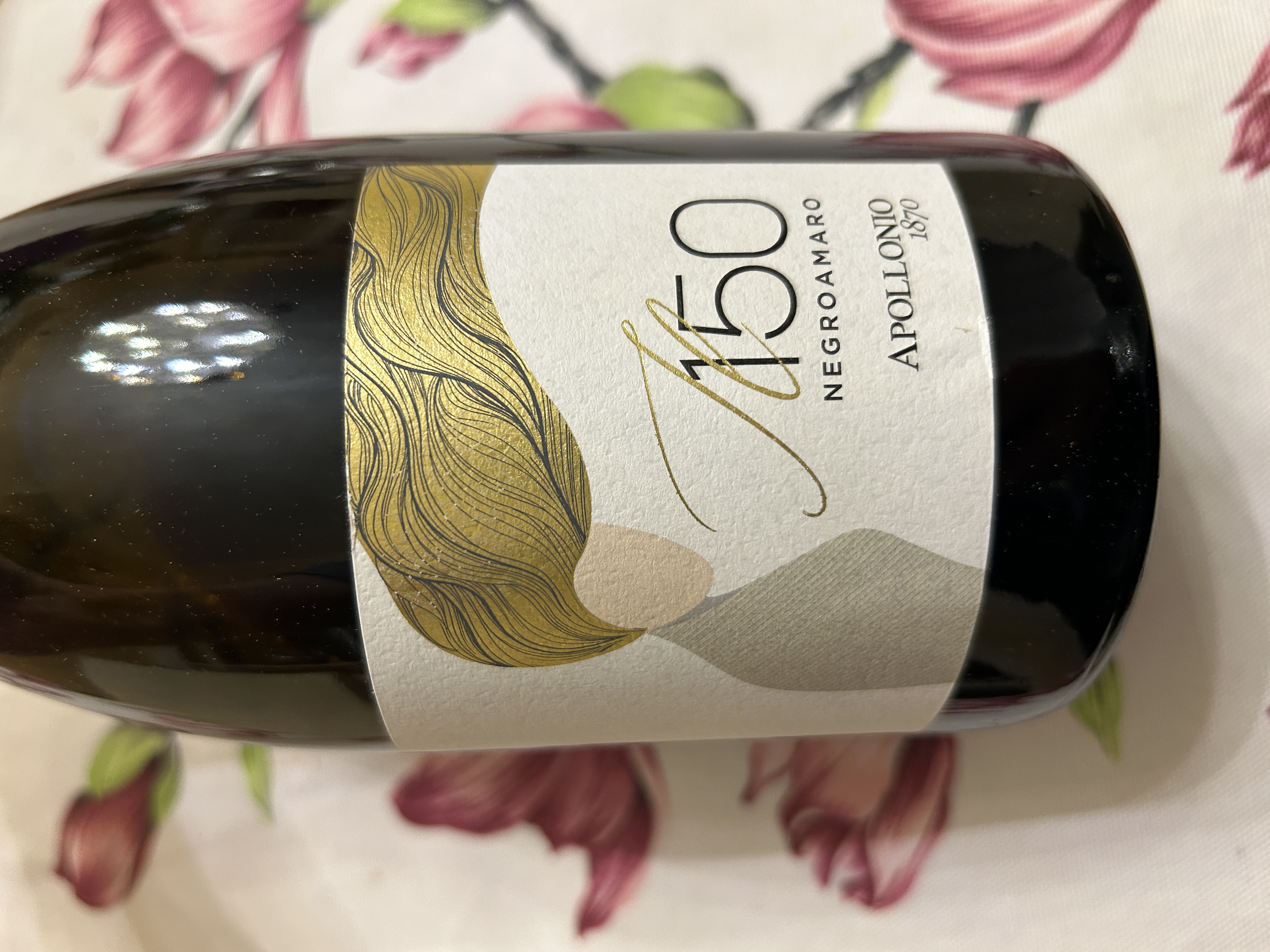 Vino rosso fermo, Negroamaro del Salento IGP, di Apollonio. Corposo, con tannini molto pronunciati e retrogusto amaro. 13.5 gradi. Assaggiato il 2023 nel 2025